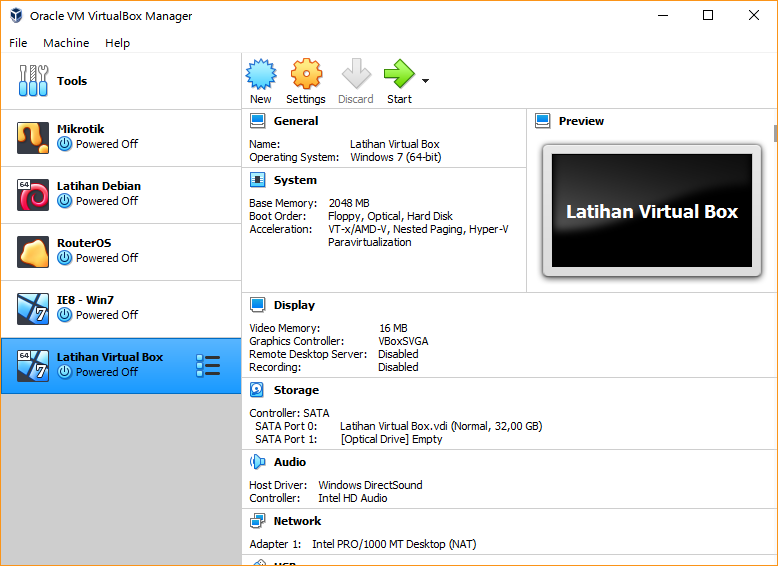 Pada gambar diatas terdapat 4 contoh Virtual Machine seperti Mikrotik, Debian dan Windows7. - Lalu bagaimana cara menambahkan Virtual Machine yang kita inginkan? Anda wajib memiliki *.iso dari sistem operasi yang akan anda install pada Virtual Box, Anda dapat mencarinya di browser.
