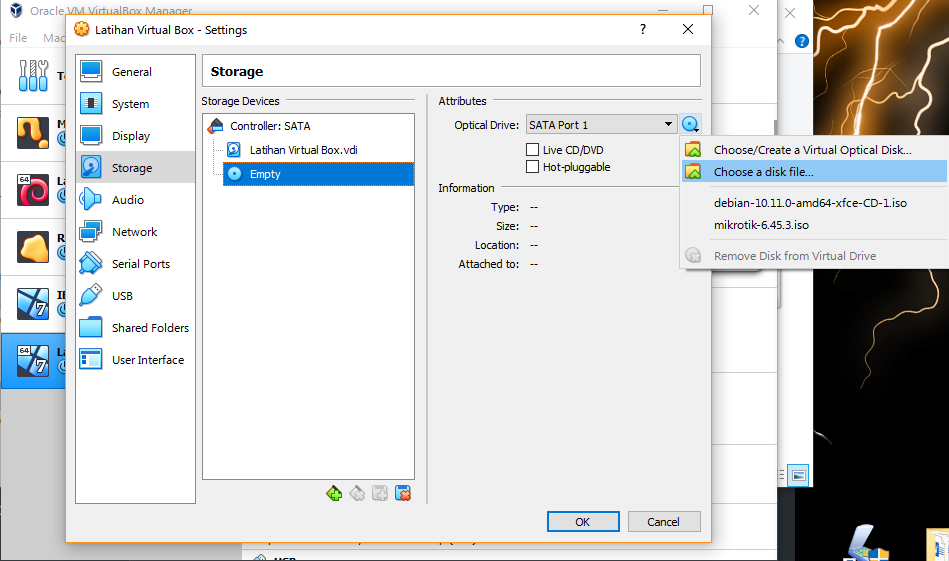 Kemudian anda klik pada bagian “Empty” (hal ini menandakan bahwa virtual machine anda belum terinstall sistem operasi apapun. Setelah itu anda harus menekan logo seperti CD/DVD. Kita klik saja “Choose Disk File” maka anda akan diarahkan pada jendela baru, disini kita akan mencari file *.iso yang sudah kita miliki.